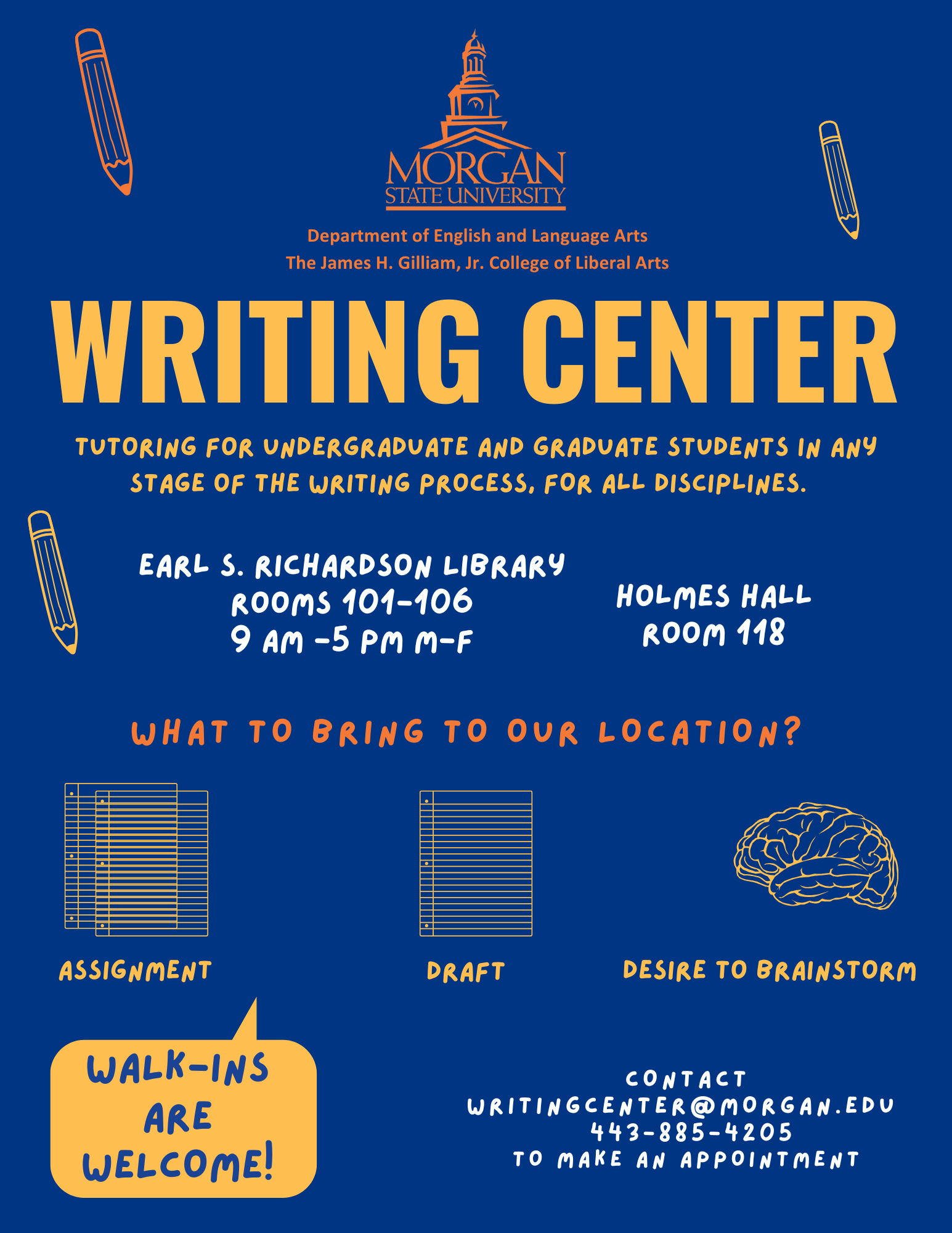 The mission of the Morgan State University Writing Center is to support undergraduate and graduate students from all academic disciplines to become more effective and confident writers and communicators. The Morgan State Writing Center provides a wide variety of services to all members of the MSU community. Their tutors are trained to give you individualized attention regarding any type of writing assignment. Typical tutoring sessions may help you with one or more of the following: